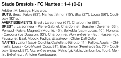 Les Brestois parviendront à réduire l’écart dans les dix dernières minutes mais cela ne changera rien à l’affaire. Le FC Nantes signe une victoire éclatante (4-1) et d’autant plus importante que ses concurrents directs se sont également montrés très actifs. La fin de saison promet d’être tendue.