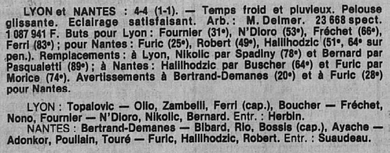 Plongeons-nous dans la nostalgie de ces années 1980 avec la retransmission d’un huitième de finale retour de Coupe de France que le FC Nantes (alors champion de France en titre) dispute à Lyon (alors en deuxième division). Nous sommes le 21 mars 1984 en direct du stade de Gerland…
