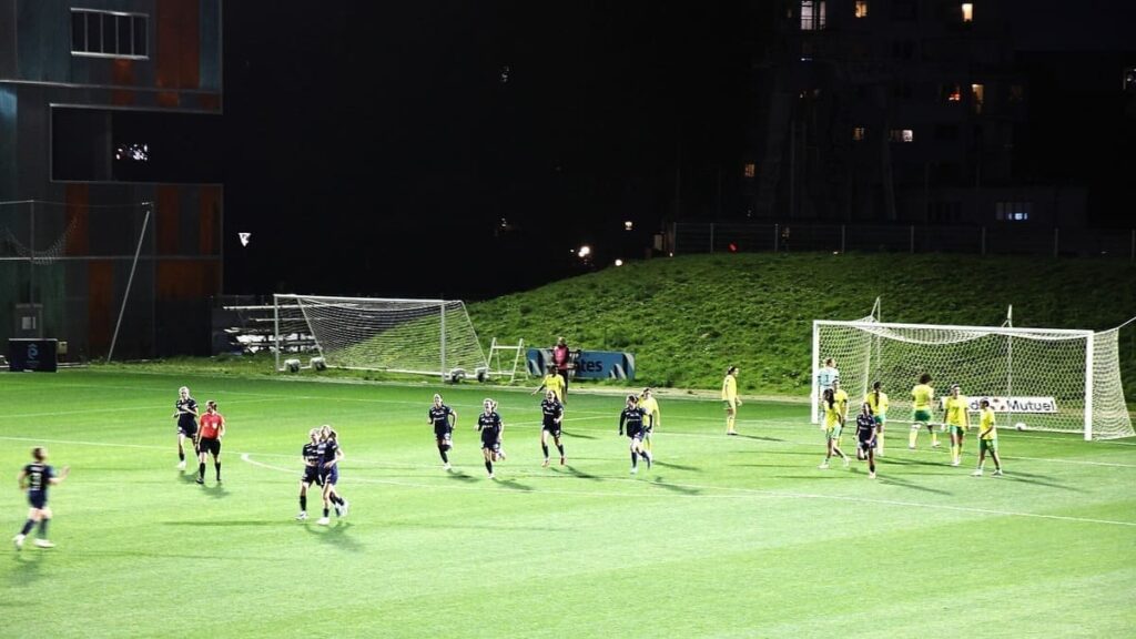 C’était la reprise pour la Première Ligue Arkéma après la trêve internationale et les vacances de la Toussaint. Les Nantaises recevaient Dijon ce samedi à Saupin pour la J7 où prenaient place un peu plus de 1000 spectateurs sous le doux soleil automnal. Et il ne fallait pas arriver en retard pour voir Léa Khélifi, à la suite d’un centre de Louise Fleury, ouvrir la marque dès la première minute lors de la première offensive.